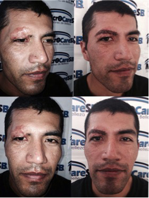 | La fibrosis desarrollada por algún traumatismo o procedimiento quirúrgico puede mejorar su aspecto de manera importante. Caso injerto de piel, pigmento sobre injerto. | |